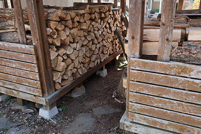 天気が崩れる前に薪小屋に運びいれることにしました。