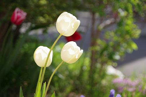 庭木は元気に花を咲かせて、昨年より増えたチューリップは庭に色どりを添えています。