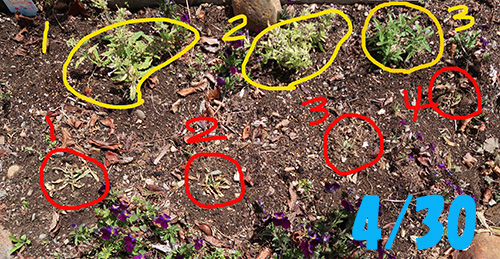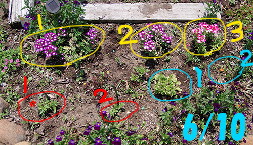 赤丸3番4番の場所には、他の場所から移動した花の苗(青丸1番)と新たに購入した苗(青丸2番)を植えました。