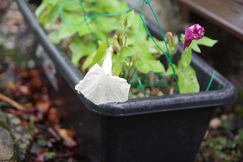 と、ぶつぶつ言っても仕方がないので、我が癒しの朝顔の写真を撮ってきました。