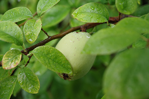 木の葉の間で育つカリンの実。